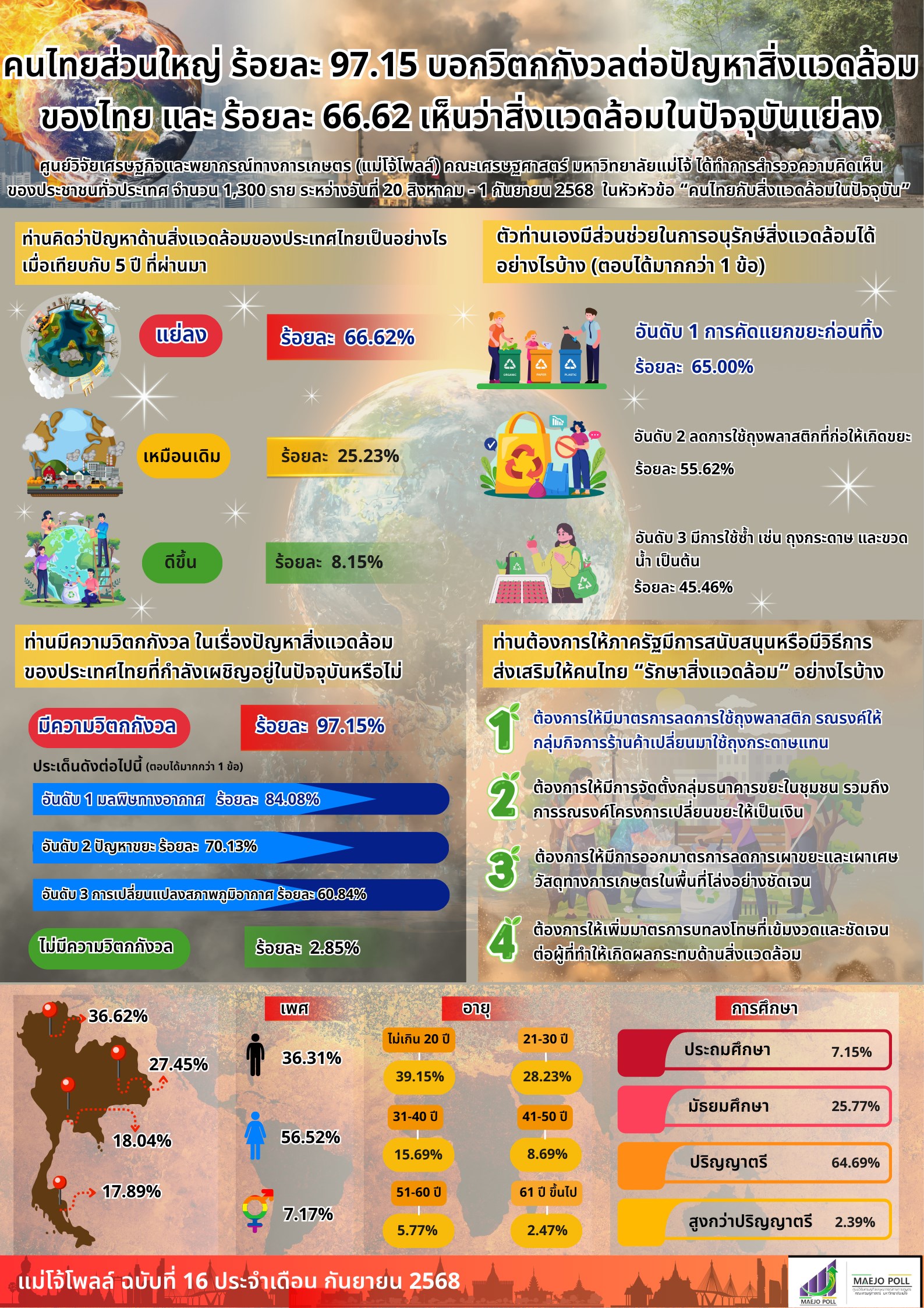 คนไทยส่วนใหญ่ ร้อยละ 97.15 บอกวิตกกังวลต่อปัญหาสิ่งแวดล้อมของไทย และ ร้อยละ 66.62 เห็นว่าสิ่งแวดล้อมในปัจจุบันแย่ลง