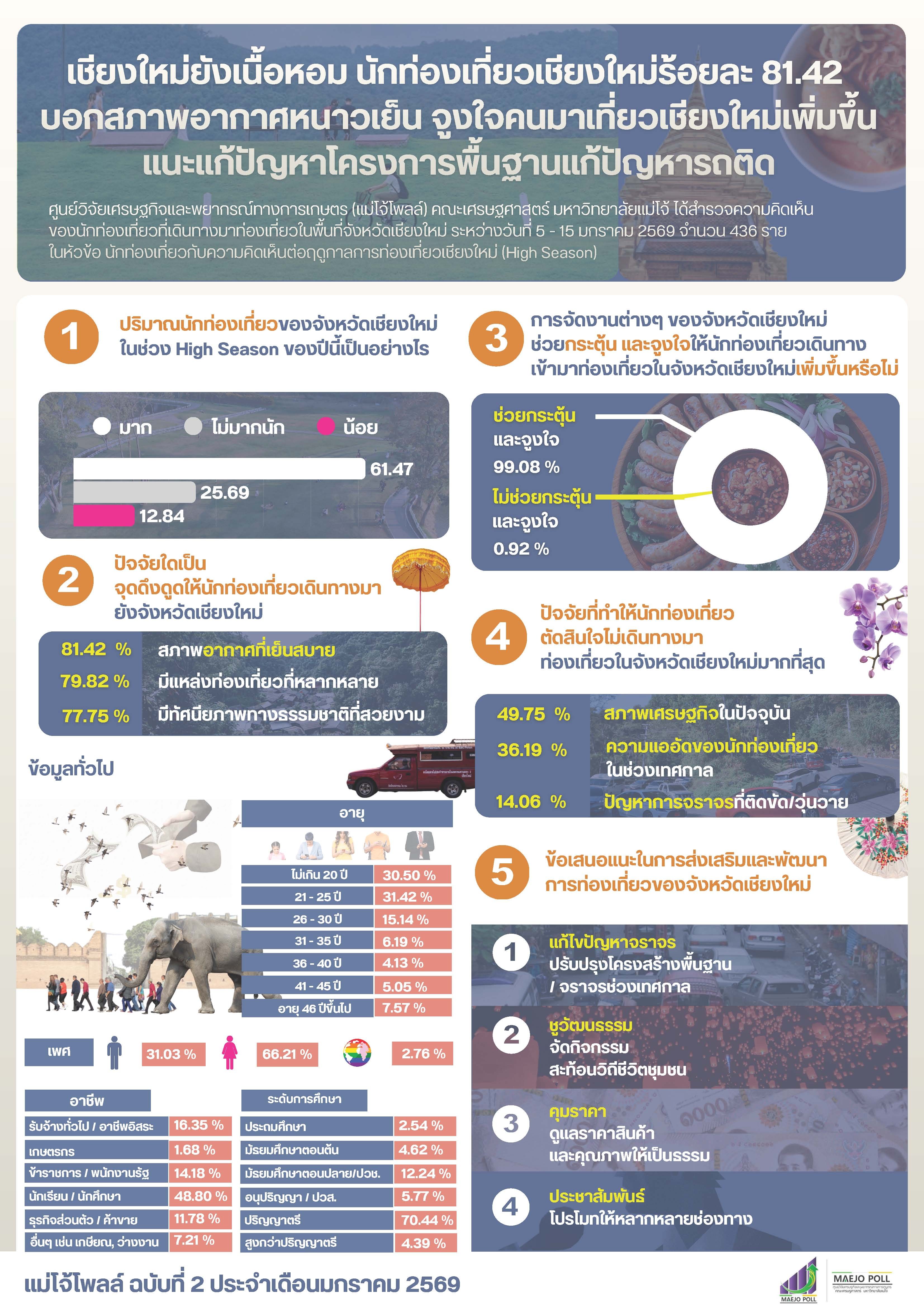 เชียงใหม่ยังเนื้อหอม นักท่องเที่ยวเชียงใหม่ร้อยละ 81.42 บอกสภาพอากาศหนาวเย็น จูงใจคนมาเที่ยวเชียงใหม่เพิ่มขึ้น แนะแก้ปัญหาโครงการพื้นฐานแก้ปัญหารถติด